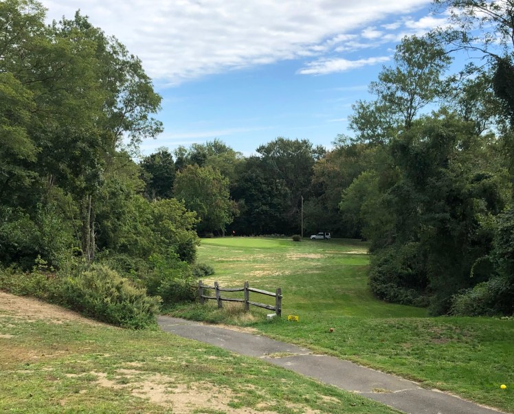 The 5th is the first of two non-blind holes at Shelter Island as an 157 yard par 3. Although the shortest and “easiest” hole on the course, this hole is no breeze with a downhill teeshot set at an awkward angle to a severely left-to-right sloping green. Due to the surrounding trees, I found it difficult to judge the wind and elevation here. This hole notably features the only bunker I could find at Goat Hill, but it was pretty overgrown with grass and calling it a bunker would be libelous.