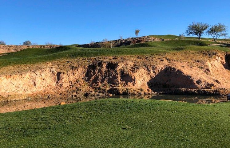 The 13th hole is a really interesting one and one that gives the golfer ample options from the start. Officially 341 yards on the scorecard, this hole plays as a sharp dogleg right with an immediate 190 yard carry over water to reach a fairway that turns immediately right. This green is hidden behind hills on the right but I suppose somebody who hits it high and long could reach this green by aiming over the hills. For the normal golfer, you’ll need to carry the water but driver might be too much and run through the fairway into a bunker or worse – into the desert. This approach runs uphill to an elevated, severely back-to-front sloped green defended by bunkers short on either side.