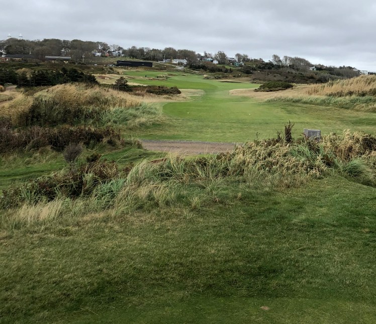 At 620 yards, the final par 5 11th is the longest hole at Cabot Links and one of the best long three-shotters I’ve played. A true journey, this winding dogleg right initially features a somewhat straightforward teeshot to a very generous fairway lined by a right hidden bunker at 275 yards. The fairway then dips into a valley, narrows to nothing around 350 yards with five penal bunkers down the right, and turns sharply right. On their second shot, golfers must navigate this valley and carry their ball onto the next slab of uphill, rumpled fairway that slopes left-to-right. Hidden bunkers cross the fairway about 100 yards short of the green and a chasm of rough divides the fairway and shallow green that juts out to the right with a reverse Redan design.