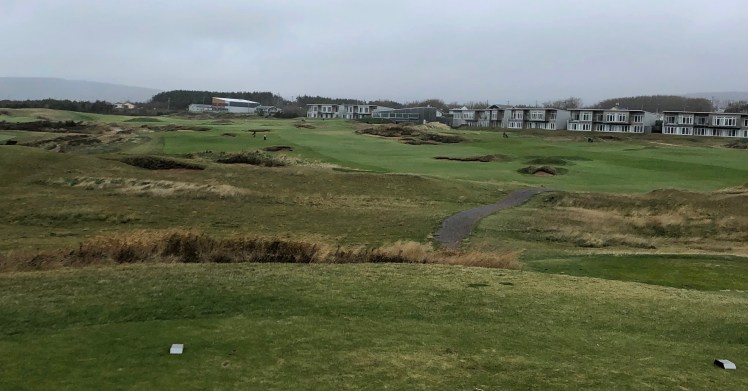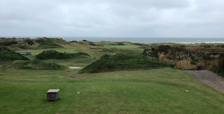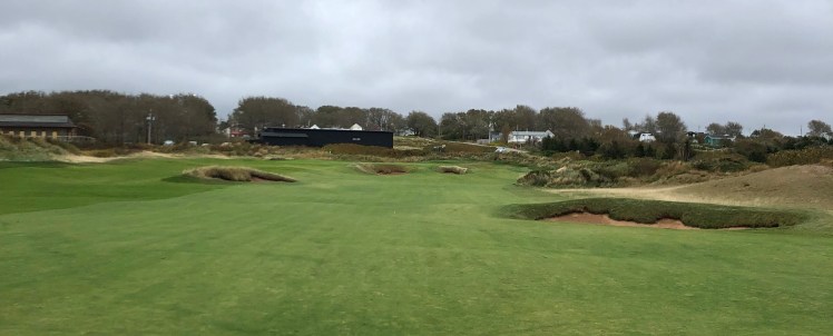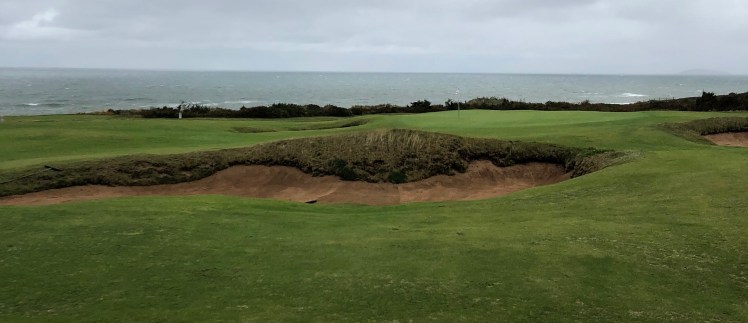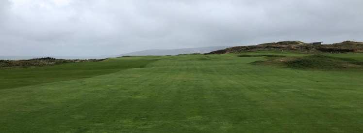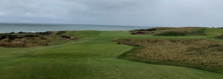 At 580 yards, the 8th hole is a wonderful lengthy par 5 running along the water. One of several holes that requires a significant carry from the Back tees, this fairway is at least a 225 yard carry over gorse, something neither of us was able to do with gale force winds in our face. Once you reach the fairway, this hole runs slightly uphill with numerous undulations and OB on both sides for the first 400 yards. After this point, the fairway becomes shared with the 13th hole and continues with a giant shared green. This back-to-front sloped green is about 100 yards wide and guarded by a bunker left and mound of fescue short with a giant false front.