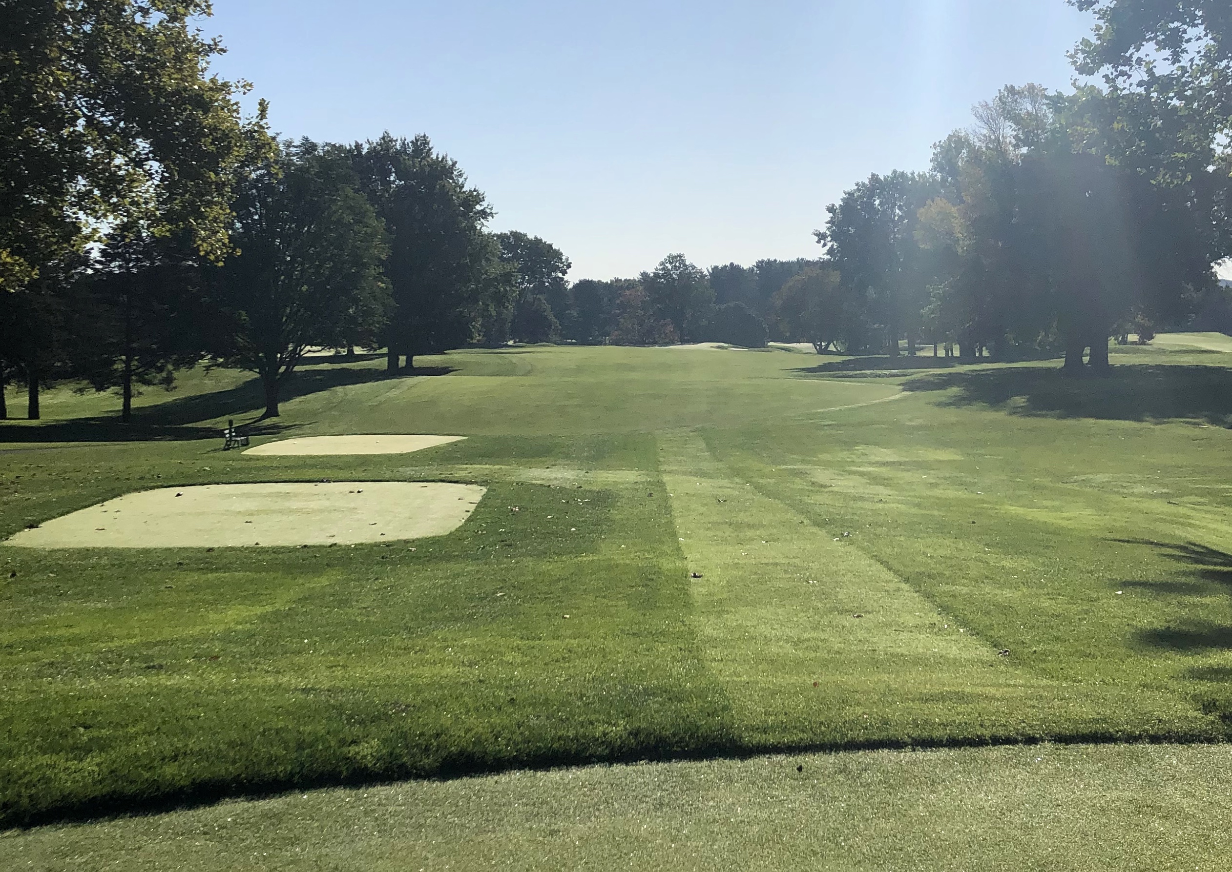 The majority of Monroe’s front 9 is routed north-south, while the back 9 plays along a ridge in an east-west configuration. It opens with a 403 yard straightaway par 4 that’s all in front of you. OB and two crossbunkers at 200 and 275 yards line the right side of an otherwise generous and forgiving fairway. This large green is subtler than most but guarded by a false front and deep bunker short left.