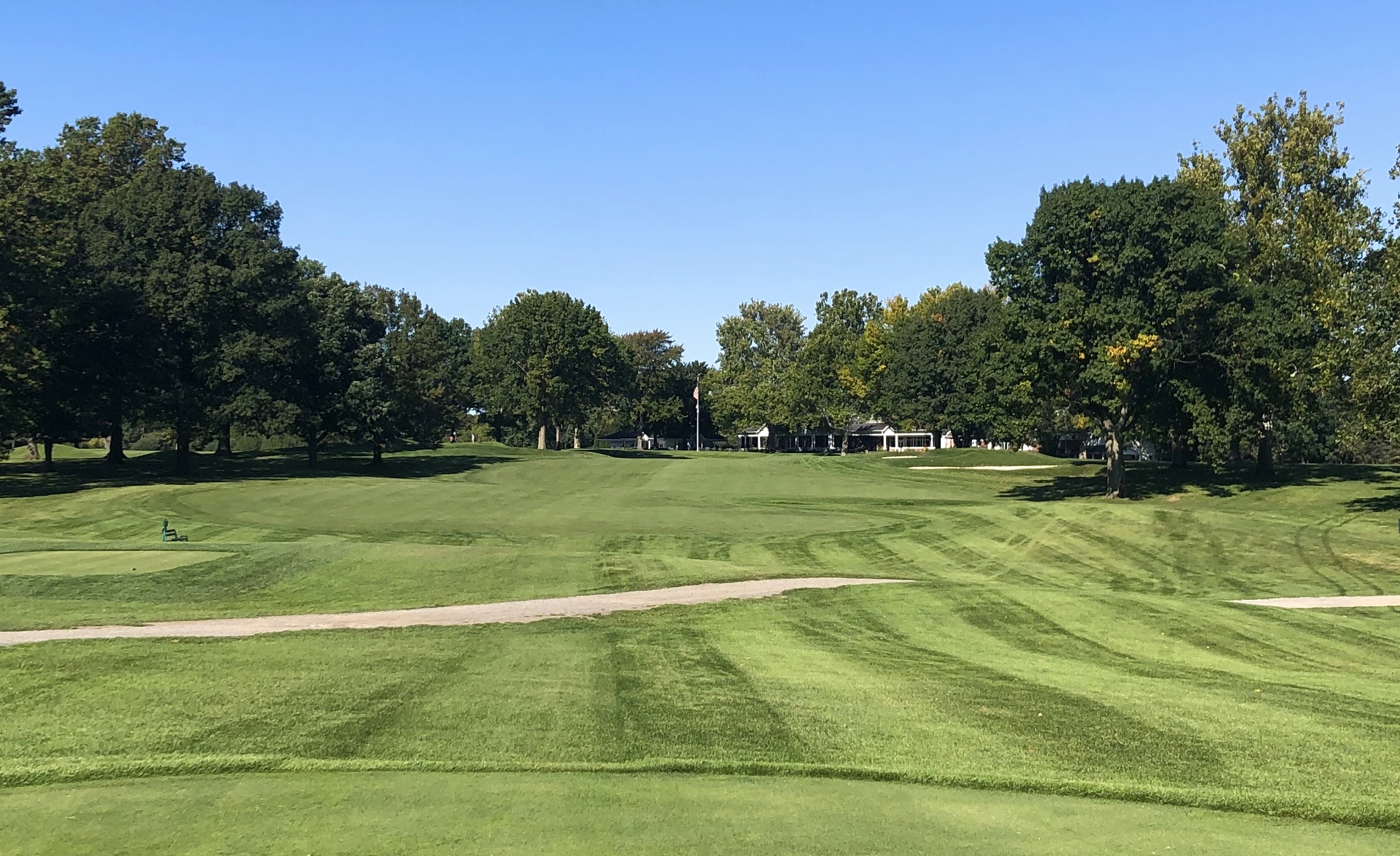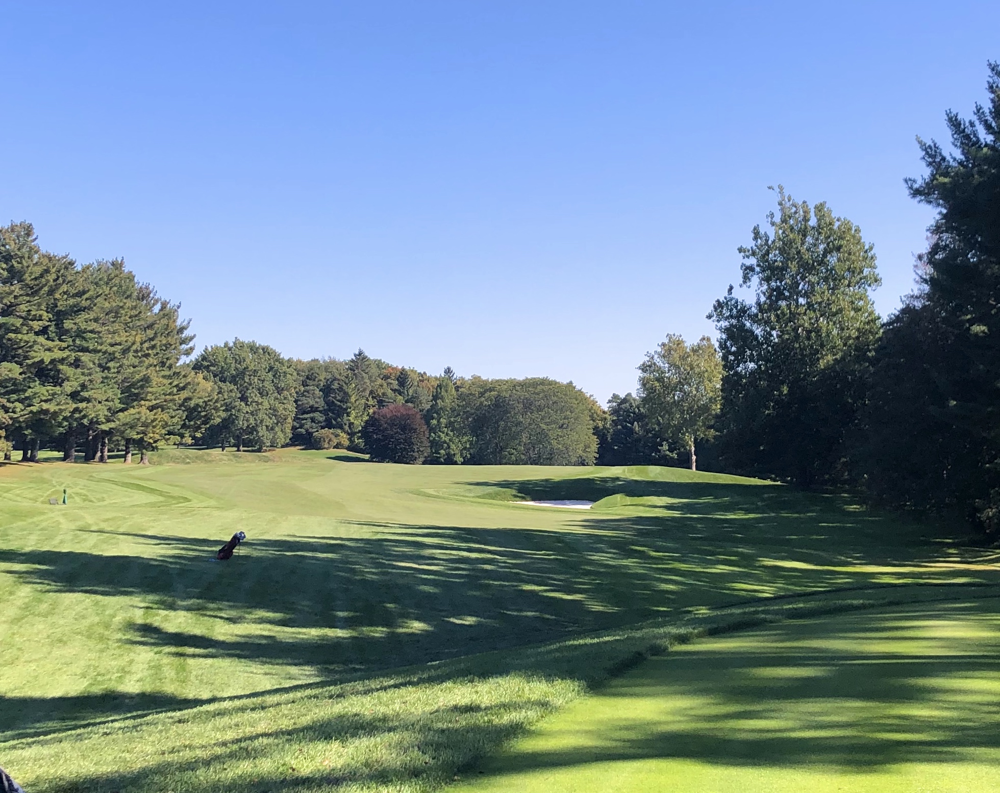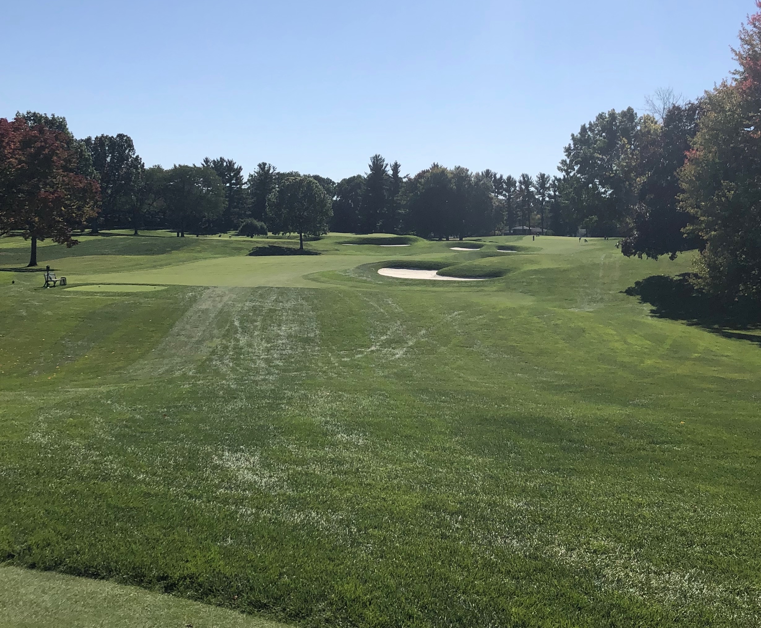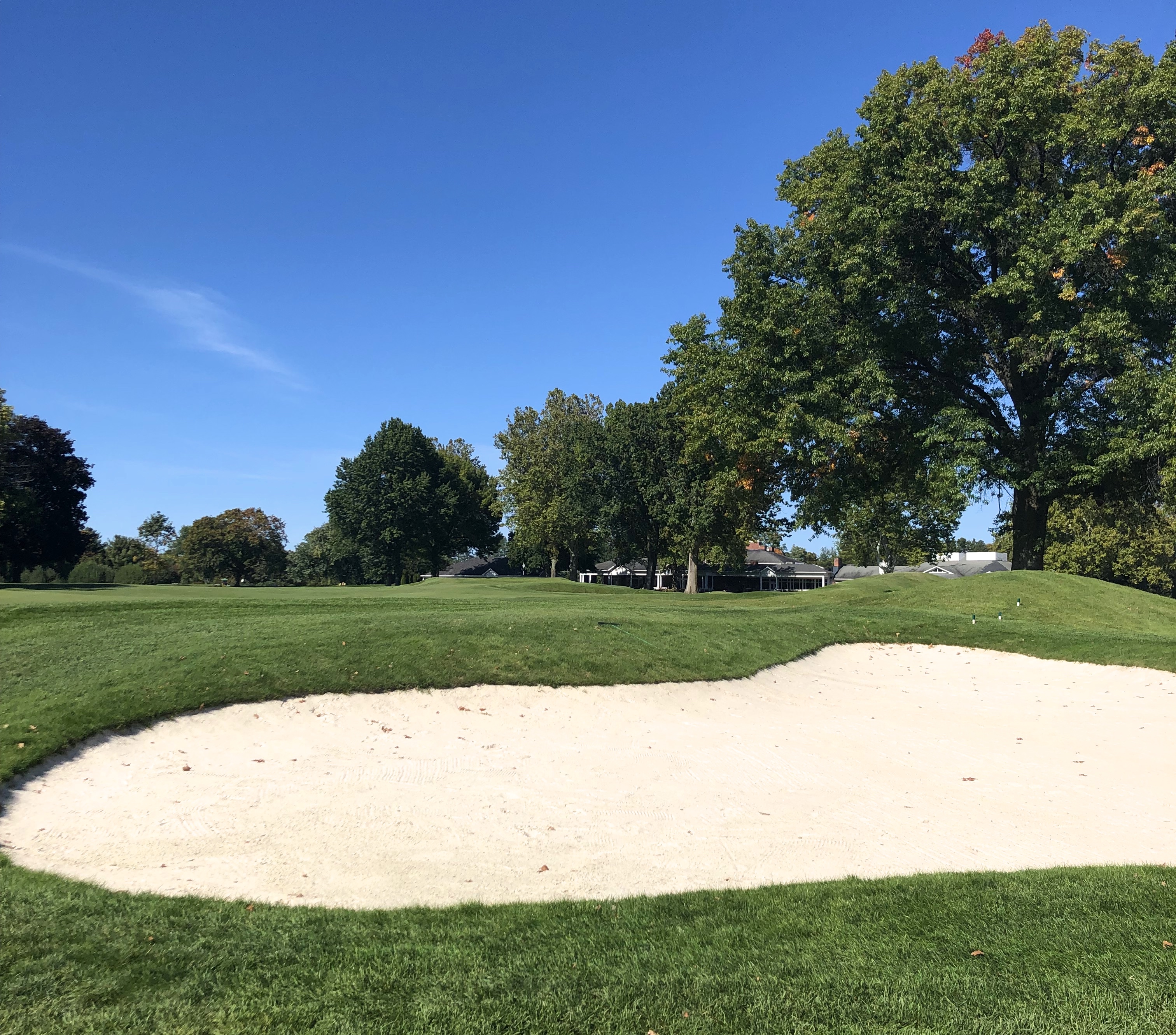 Monroe closes with a difficult 416 yard par 4 that runs uphill and usually into the wind. A straight teeshot is required, with a generous tree-lined fairway defended by numerous bunkers down the right between 200 and 240 yards. While this hole is a tough GIR for most, the most difficult aspect might be the green, which features two tiers and a diagonal swale running through its right half. Par is an admirable score here and I imagine many Monroe Invitationals come down to this hole.