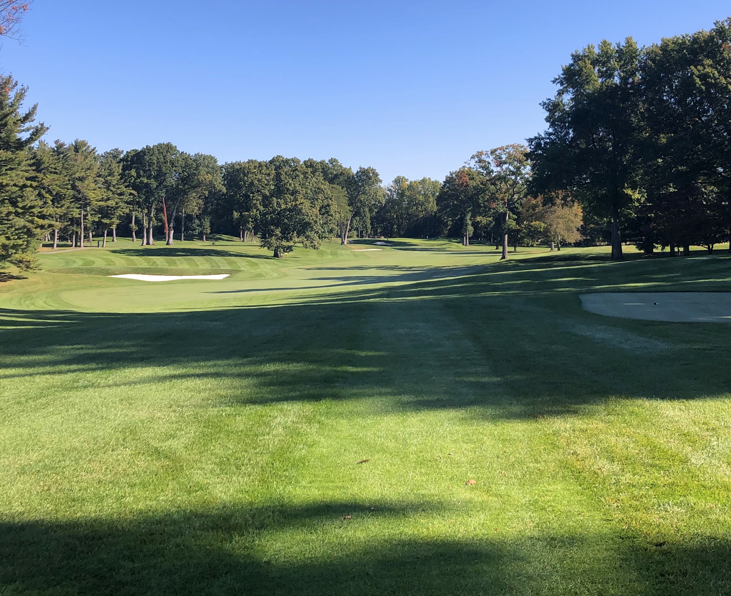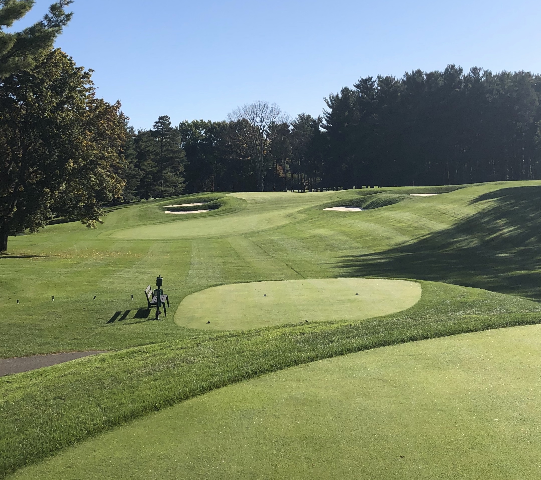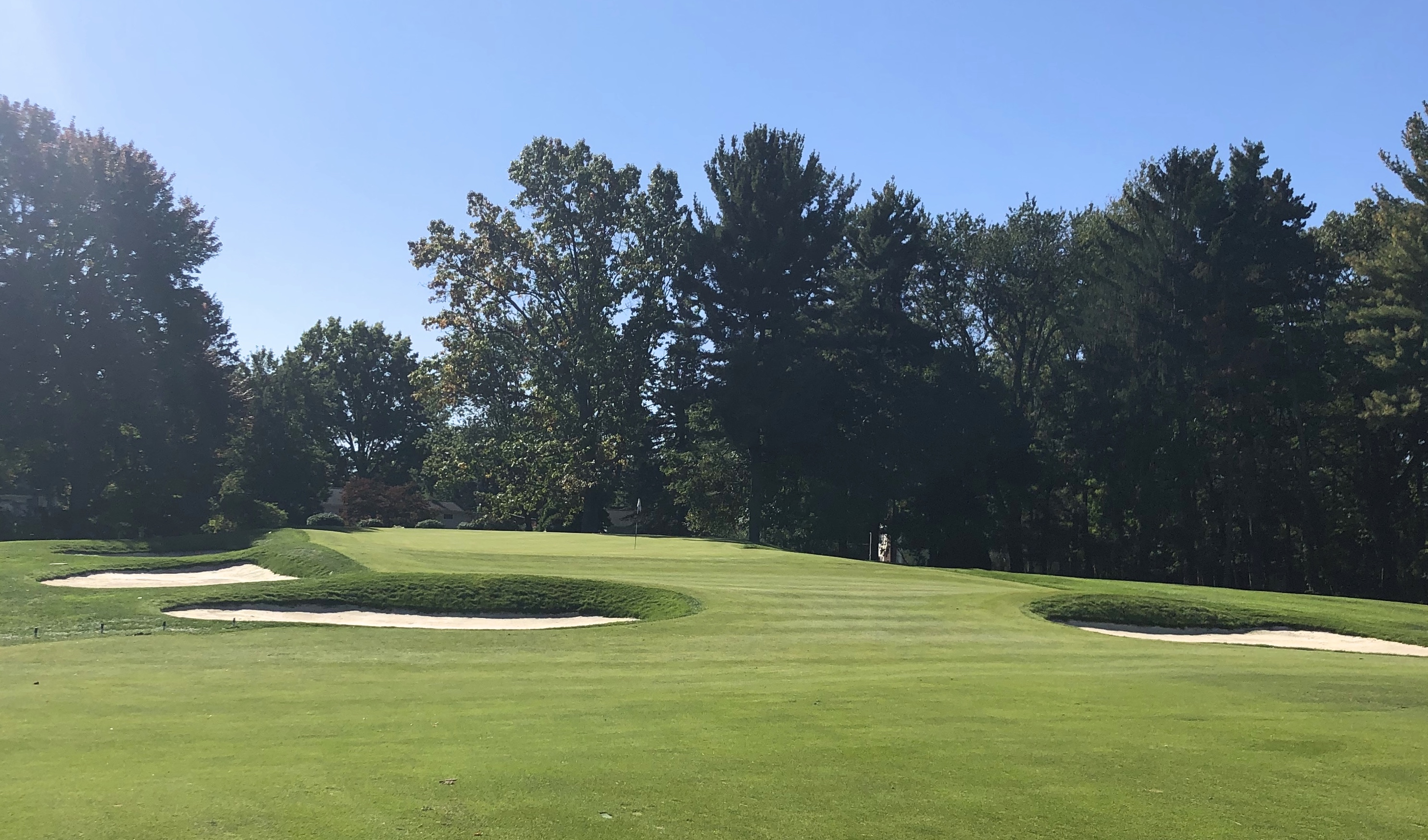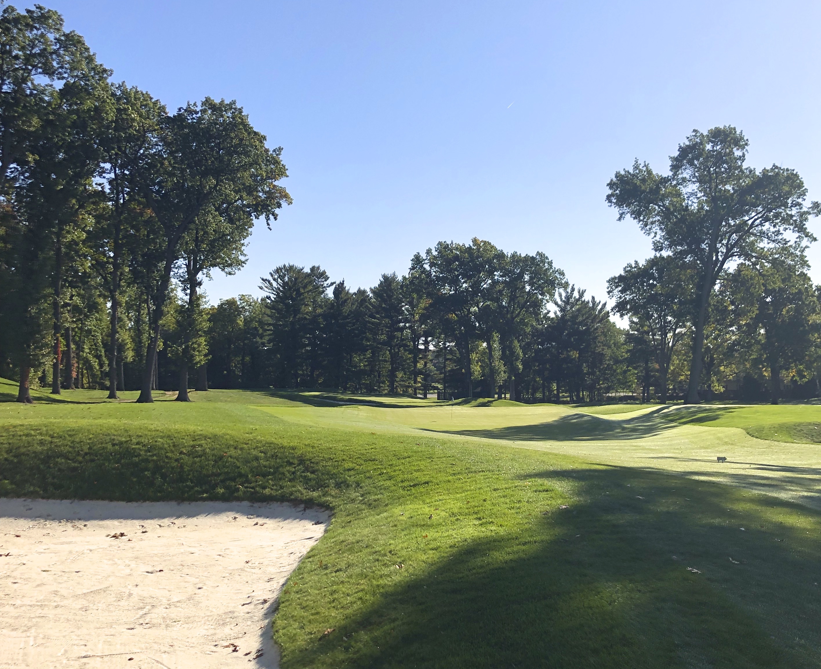 The 2nd hole is the shortest par 4 at Monroe at 346 yards, and not dissimilar to Oak Hill East’s 2nd, playing straightaway with a progressively narrowing fairway. This is a tight, tree-lined hole with excellent crossbunkering down the left at 175 and 250 yards and right at 200 yards. A set of barrier bunkers lies just short of this green, while additional bunkers line either side of the putting surface, creating a beautiful and intimidating approach. This is one of the most severe greens on the course, with a steep back-to-front slope off a back plateau.